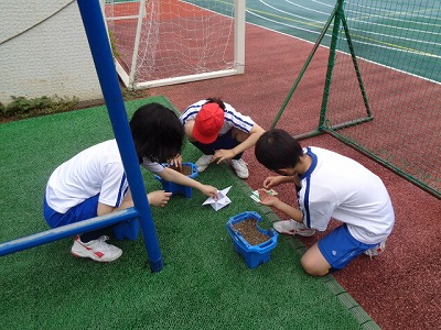 植木鉢に入れる土の量や種を入れる深さ、間隔に気をつけて、種を蒔きました。