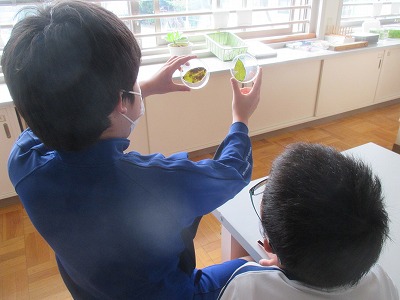 今日は、天候の都合で先送りにしていた「植物の成長と日光の関わり」の実験をしました。