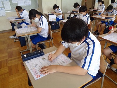 「対称な図形」「分数の計算」のテストでした。今回の計算は、いつも宿題で解いている問題より随分簡単な問題です。ミスなく解いて、満点をとってほしい問題でした。