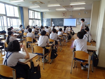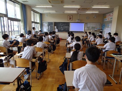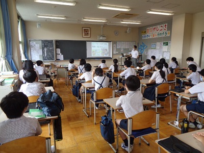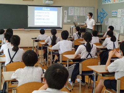 昨年から、一人一台のタブレットを活用している6年生。 操作に慣れてきた事もあり、インターネットの世界が日常生活になくてはならない存在になってきています。気の緩みから、様々なトラブルに巻き込まれないよう、ICT担当教員から特別授業を受けました。