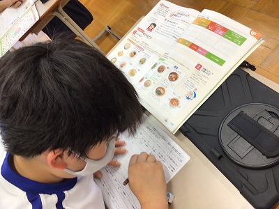 6大栄養素の成分表をもとにして、自分が立てた献立メニューの栄養バランスを調べ、プリントに記入しています。