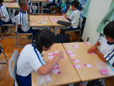 今日と明日の2日間は、生活科の時間を使って「もも色カルタ大会」を計画しました。