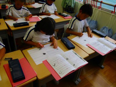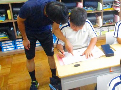 アルファベットの小文字練習です。“1階の所から書き始める”や“地下に下りて”など、4本の線に注意し、書き順のポイントを教わっているところです。