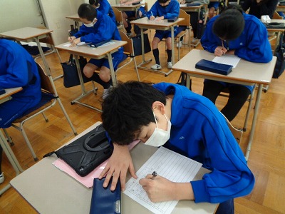 問題を読み上げるのと同時に、6年生みんなの鉛筆を走らせる音が教室に響きます。6年生の漢字を全て覚えるために、引き続き漢字大会に取り組みます。