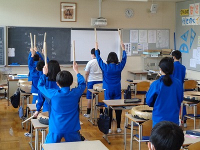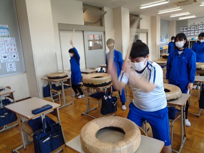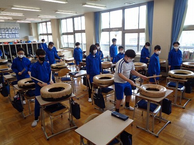 「龍神太鼓」組は、タイヤでの締太鼓の拍子に合わせて、教室での練習。