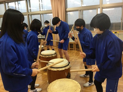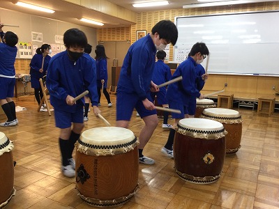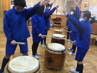 「嵐山太鼓」組は、音楽室の和太鼓で練習することができました。昨日の練習で、演目を通して演奏することを身につけたので、今日は和太鼓を使って、力を確かめる時間を過ごしました。