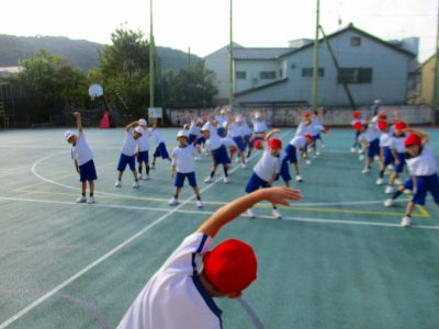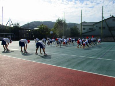 日直さんの先導で、さわやかな青空の下、準備体操からのスタートです。
