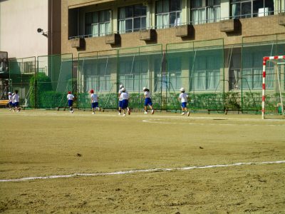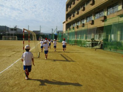 体操の後は、中学・高校のグラウンドで5分間走を行います。