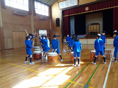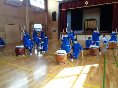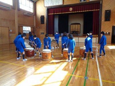 体育館に行く前に、太鼓の叩くときの衣装である法被と帯を教室で渡しました。