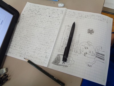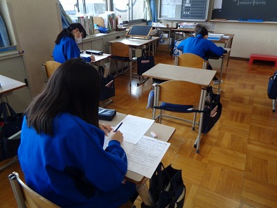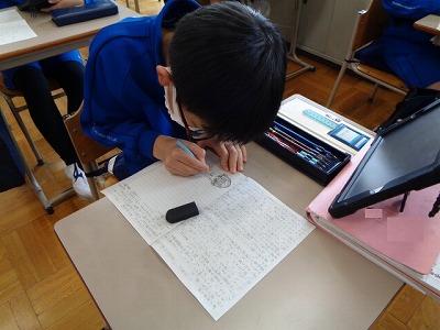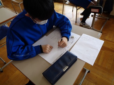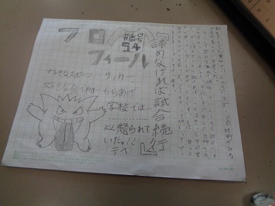 清書用のコピー用紙に「座右の銘」の作文、プロフィールなど丁寧に書いているところです。